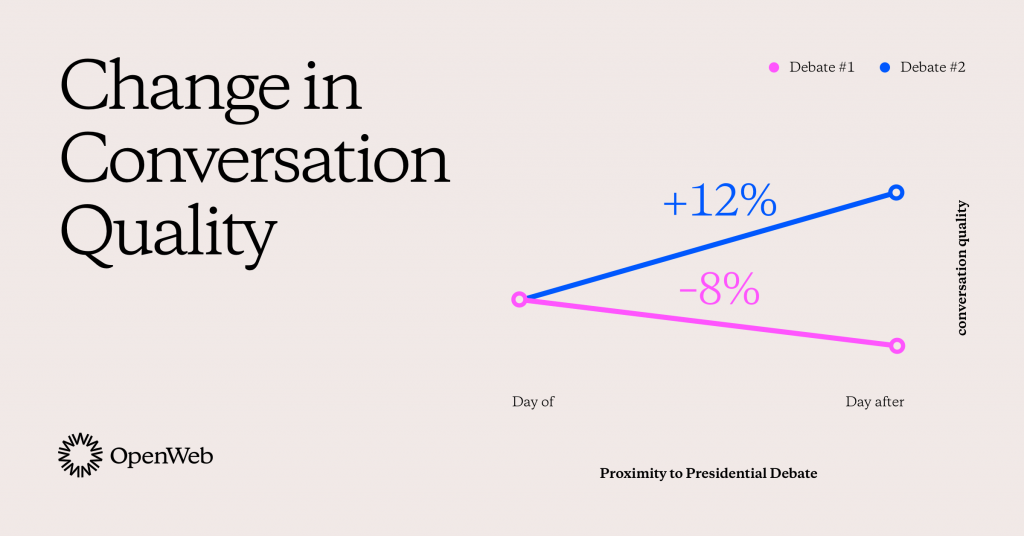 At OpenWeb, we routinely collect user feedback across publishers to assess the quality of their conversations. After debate #1, users reported an 8% decrease in quality conversations. According to Merriam Webster, terms like white supremacy and racism were trending post-debate. Not surprisingly, the toxicity we saw between the two candidates was mirrored in public conversations.