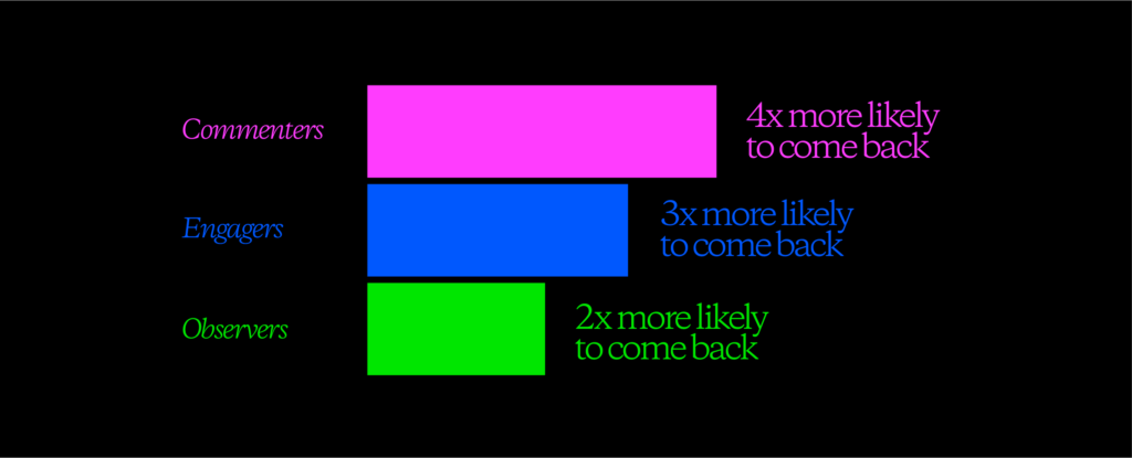 The numbers here speak for themselves: in the period under discussion, users who commented on our partner’s articles were 4X more likely to come back the following week. And the numbers were just as stark for those who didn’t comment at all. Engagers—people who upvoted or downvoted a comment—were over 3X more likely to return, while those who merely observed the comments without engaging were more than twice as likely to return.